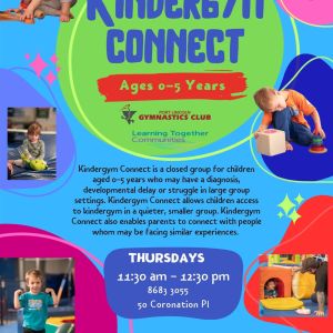 Kindergym Connect ( additional needs) Kindergym Connect is a FREE closed group for children aged 0-5 years who may have a diagnosis, developmental delay or... 12 Dec 8:00 am - 6:00 pm