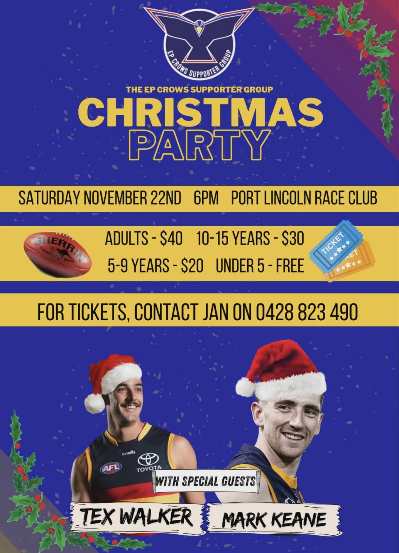 This is our Annual Christmas Event with Attending players from the Adelaide Football Club. Our Number 1 Ticket Holder Taylor Walker and Defender Mark Keane. Guaranteed fun night with Door Prizes, Lucky Draws and Auctions