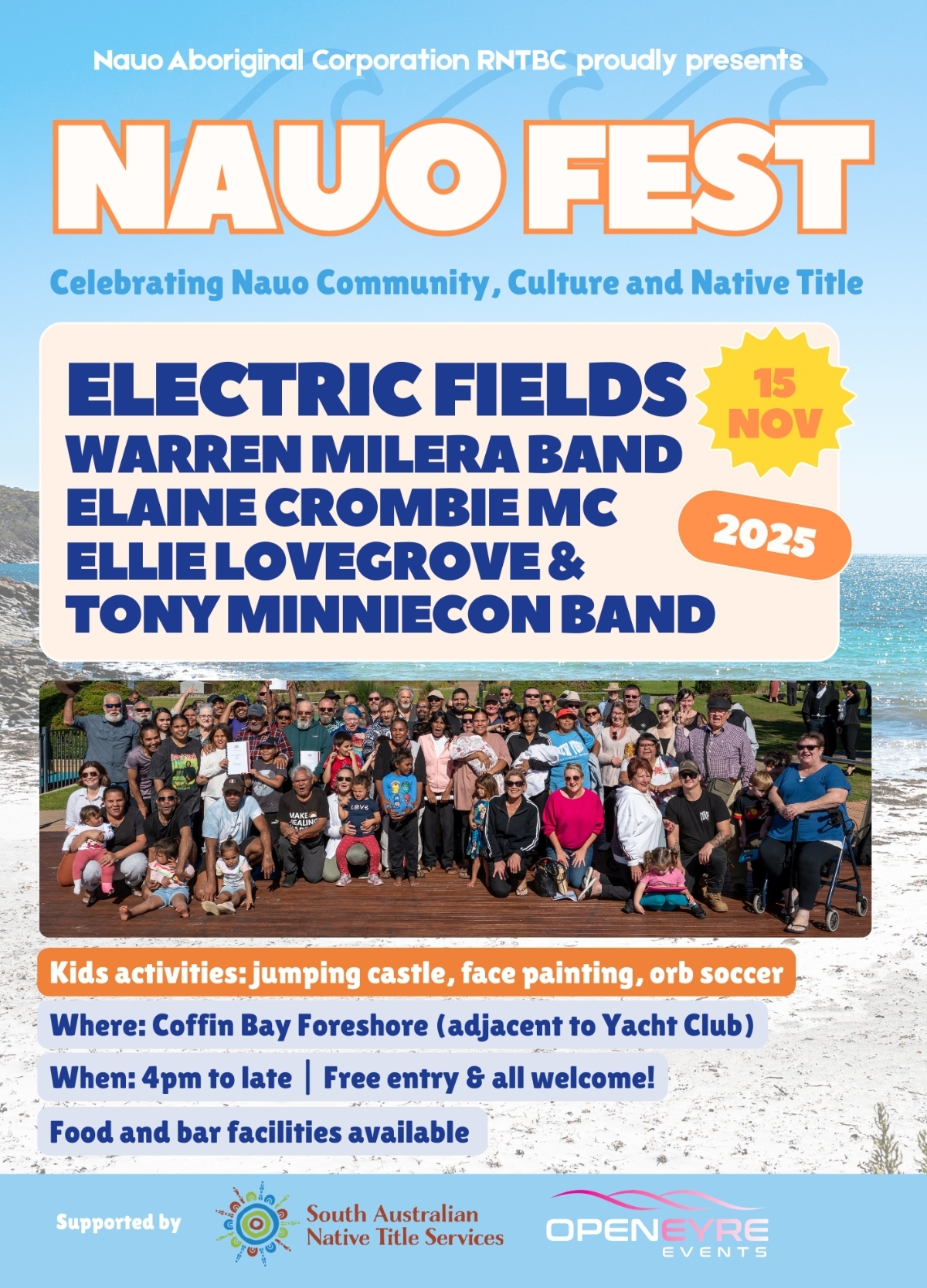 The Coffin Bay Foreshore Lawns will come alive from 4 pm to 10 pm on Saturday 15 November for Nauo Fest a FREE community celebration honouring the Nauo people’s historic achievement in securing Native Title rights over significant areas of the Eyre Peninsula in 2023.