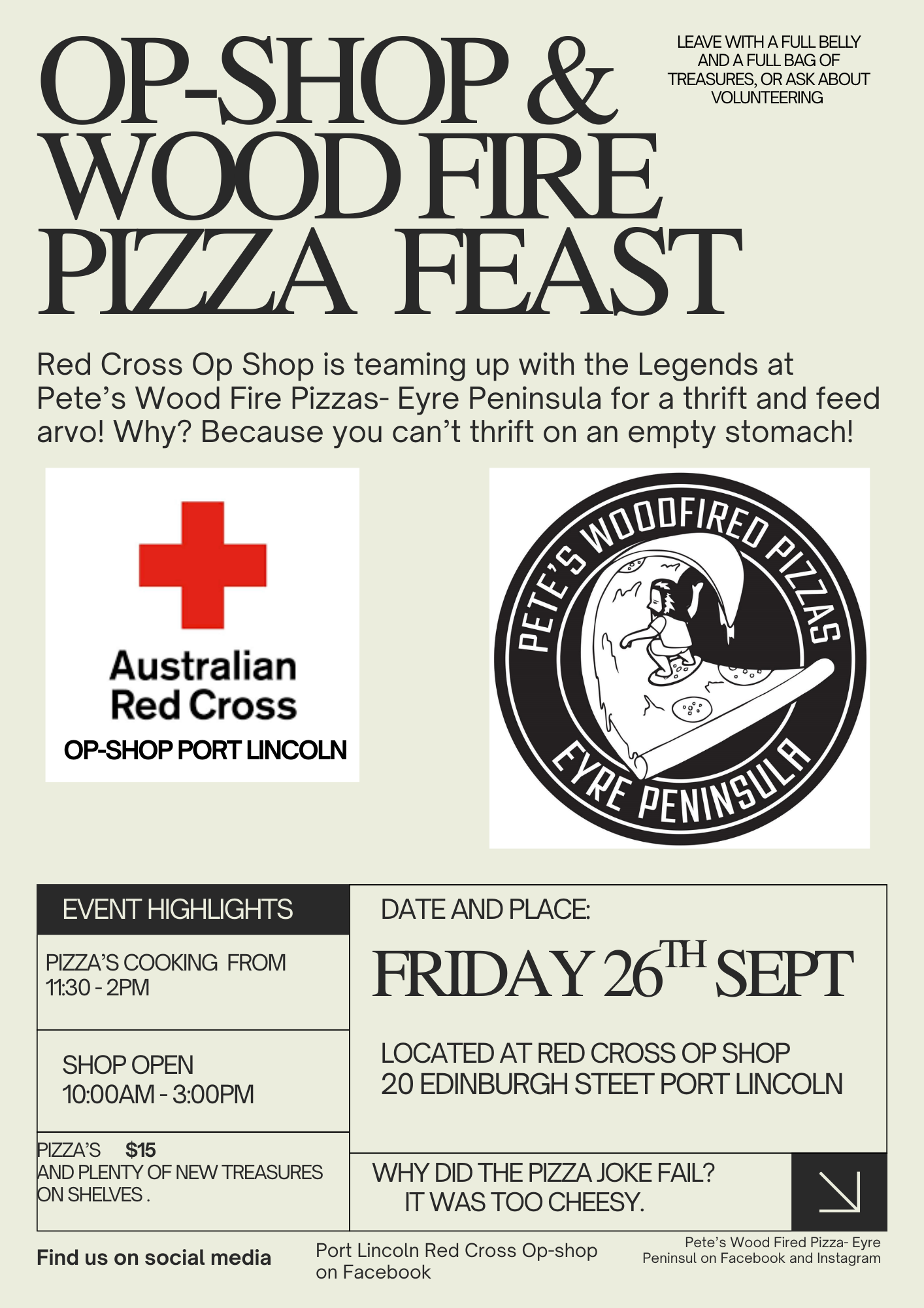 Red Cross op shop is teaming up with Pete’s wood fire pizza’s.